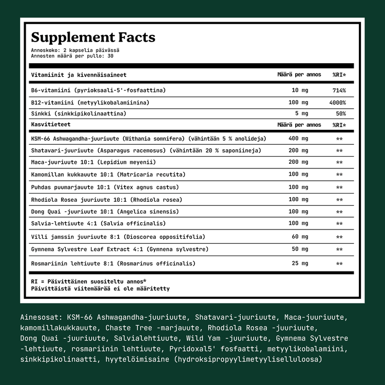 Auttaa tasapainottamaan stressihormoneja, helpottamaan PMS-oireita ja vaihdevuosien oireita**
